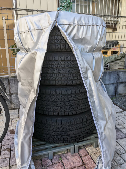 今年の4月にスタッドレスタイヤの保管用としてタイヤカバーとすのこを購入しました。12月になりタイヤ交換の時期になったので、カバーを外すことに・・